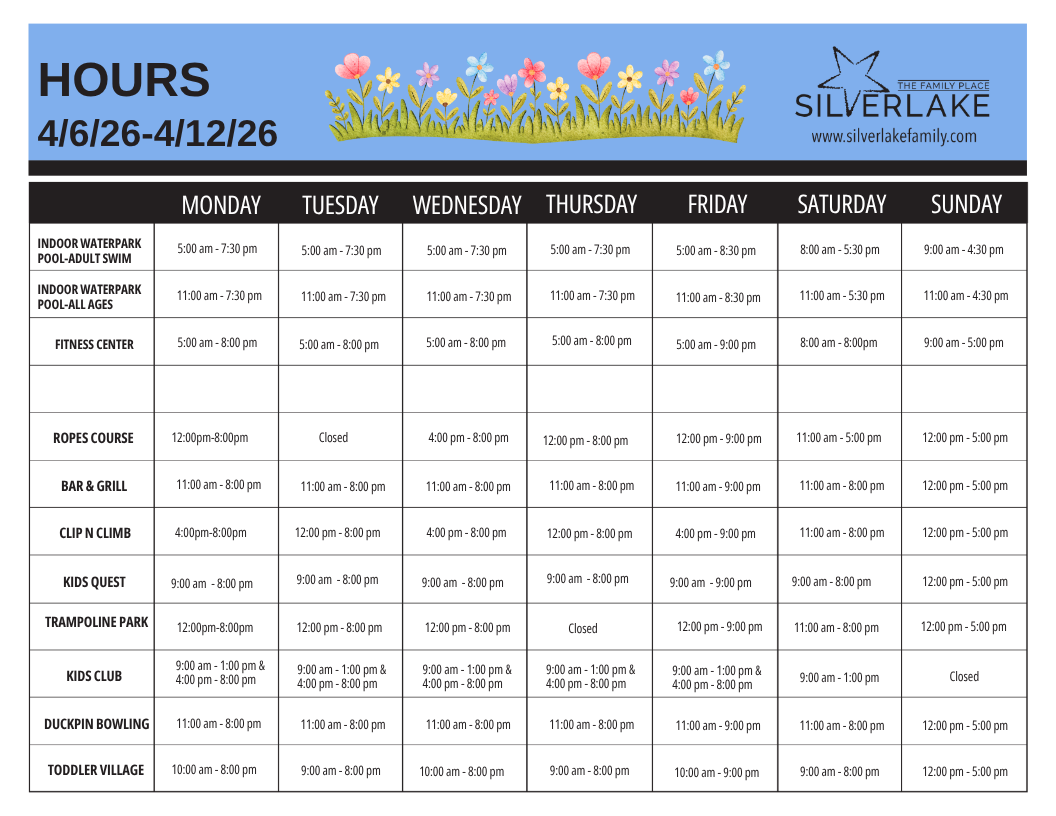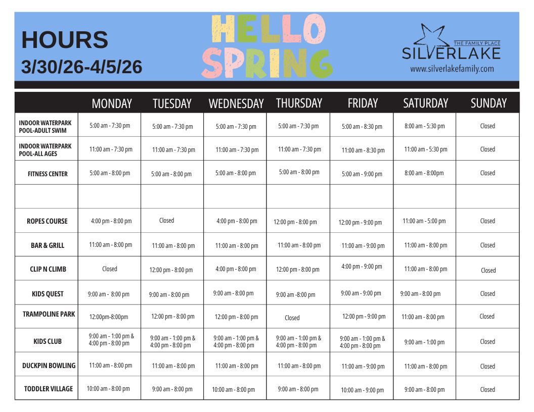 | INDOOR WATERPARK POOL-ALL AGES | 11:00am – 7:30pm | 11:00am – 7:30pm | 11:00am – 7:30pm | 11:00am – 7:30pm | 11:00am – 8:30pm | 11:00am – 5:30pm | 11:00am – 4:30pm |
